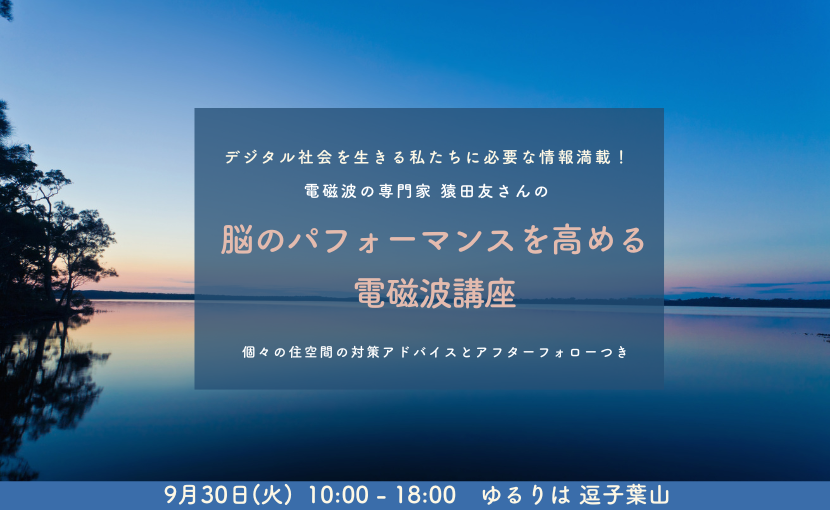 9月に電磁波本講座を開催します。少人数制のため、残席2名で締め切りになります。ご参加希望の方はお早めにお申し込みください。(今日現在週末の企画は保留ですが、11月の週末にもご要望あれば開催するかもしれません。参加希望の方はご連絡ください。)