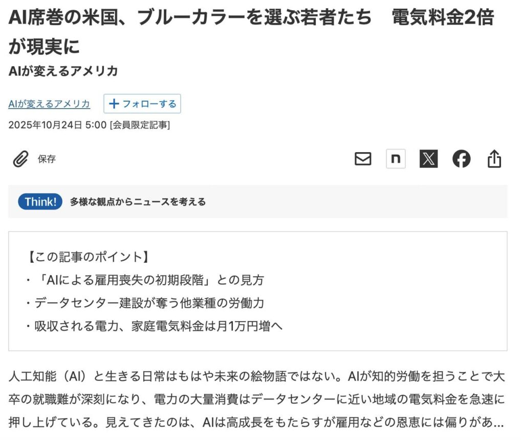 AIという利便性の闇(雇用がなくなるとかそういうのもあるが、それとは別に)。何かを誰かを犠牲にして見ぬフリして人類は滅びへ進んでゆくんかね。またしても、アホだね、欲とか進化とか利便とか金儲けを制御できないヒトって生き物は。結局、犠牲は自分に戻ってくるというのに。AI で一つ何かを調べると冷却に500mlの水を浪費する。電気も莫大、データセンター周辺に住まう人の犠牲、人への健康被害、、、、、。以下、全て日経より。