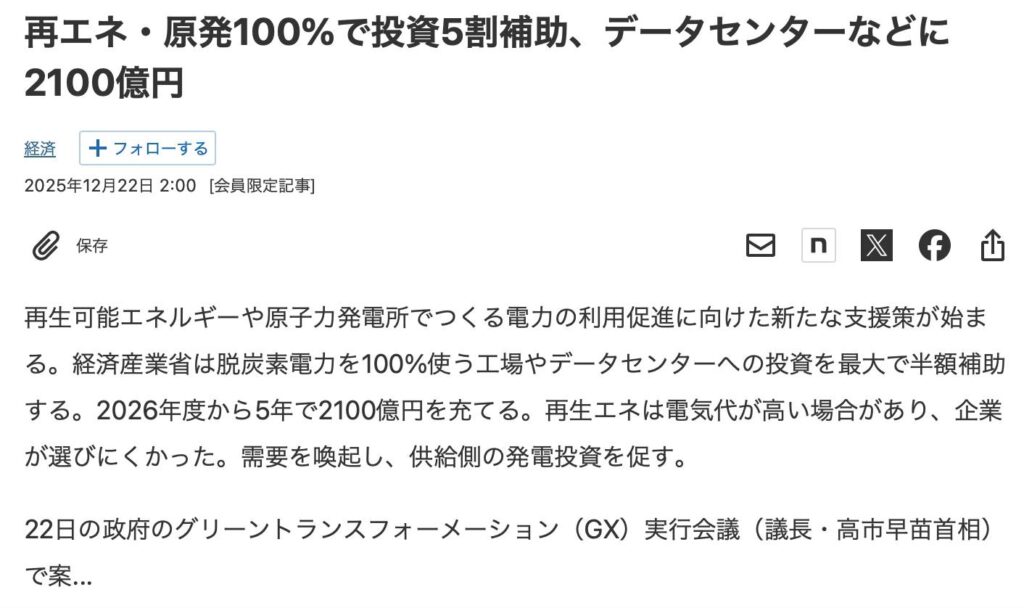 昨日の投稿に関連して今日の日経から。民間のデータセンター建設投資に国が最大5割補助。しかも条件に原発か再エネ100%で、と。原発は脱炭素なんて虚構。再エネはまだわかるが、だとしたらメガソーラー補助を無しにすると発表したばかりなので(大資本や外部資本による環境破壊型かつ地域循環型でないメガソーラーは俺も反対だが)、政府の目論見がろくでもないことが見てわかる。高市氏は原発・リニア・成田空港で国起こし、なんて記事のタイトルも昨日見かけた。国起こしならぬ、国滅ぼしだと国民に気付いてほしいよ。国を超えて人類滅ぼし。経産省はそもそもロクでもない。