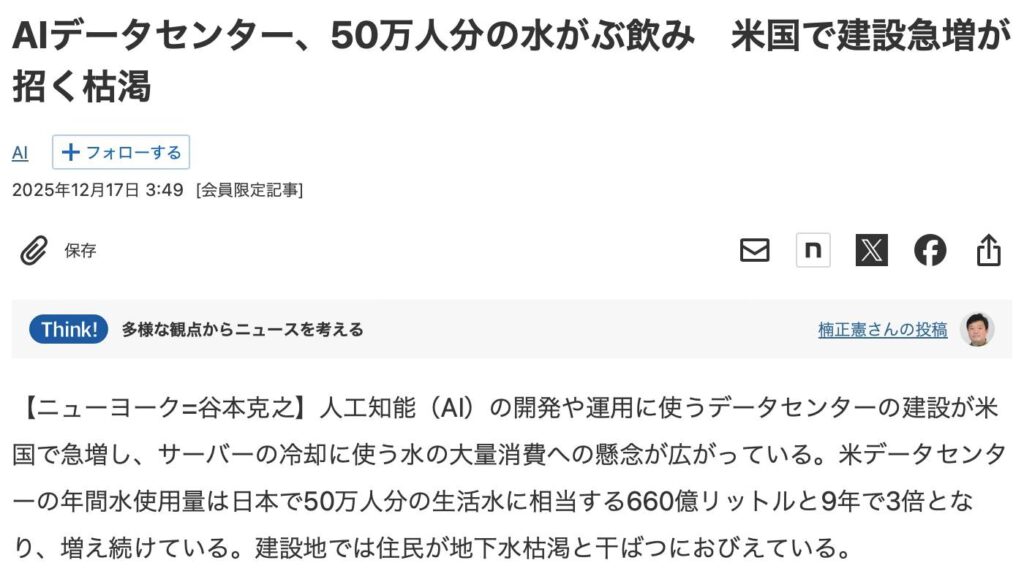 AIという利便性の闇(雇用がなくなるとかそういうのもあるが、それとは別に)。何かを誰かを犠牲にして見ぬフリして人類は滅びへ進んでゆくんかね。またしても、アホだね、欲とか進化とか利便とか金儲けを制御できないヒトって生き物は。結局、犠牲は自分に戻ってくるというのに。AI で一つ何かを調べると冷却に500mlの水を浪費する。電気も莫大、データセンター周辺に住まう人の犠牲、人への健康被害、、、、、。以下、全て日経より。