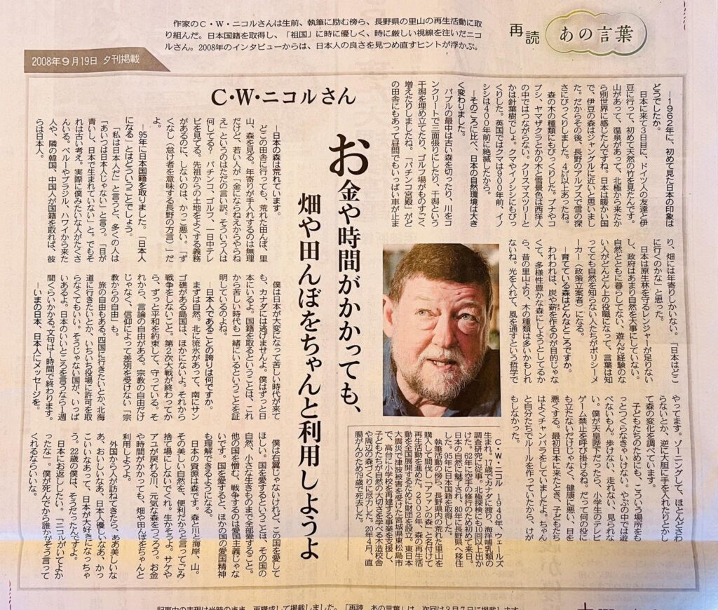 再読 あの言葉:C・W・ニコルさん作家のC・W・ニコルさんは生前、執筆に励む傍ら、長野県の里山の再生活動に取り組んだ。日本国籍を取得し、「祖国」に時に優しく、時に厳しい視線を注いだニコルさん。2008年のインタビューからは、日本人の良さを見つめ直すヒントが浮かぶ。