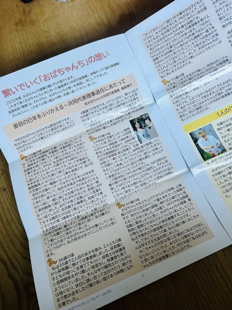 幾ちゃんが代表を卒業された「NPO法人 ふれあいの家おばちゃんち」。ニュースレターにある幾ちゃんの回顧録を読ませて頂き、13〜4年を大井町で過ごした当時を私も回顧してみると、その時代は「おばちゃんち界隈」と付かず離れずに過ごしていた年月でした。世田谷区から品川区へ越したタイミングで、「子どもの足や靴、環境づくり」の啓蒙活動をしたいと燃えたぎってた私が、最初にコンタクトを取った方々も、緩く出展で関わった子育てメッセも「おばちゃんち界隈」の方々で、幾ちゃんは娘の上がった小学校のすまいるスクール(区が運営する校内にある放課後の居場所)の主任職員でした。外遊びやプレーパーク推進で共通価値観を持っていて、そこから天野秀昭さんの講演会企画や、「はらっぱ」運営に関わらせて頂く事に。幾ちゃんが運営していた時代のすまいるスクールは、子どもにとっても預ける親にとってもパラダイスだったと思います。すまいるでの子どもの様子から伺い知れる事から、幾ちゃんは親に子どもに寄り添った子育てのアドバイスをする事も。私もハッとさせられるアドバイス、頂きました。有り難かったです。